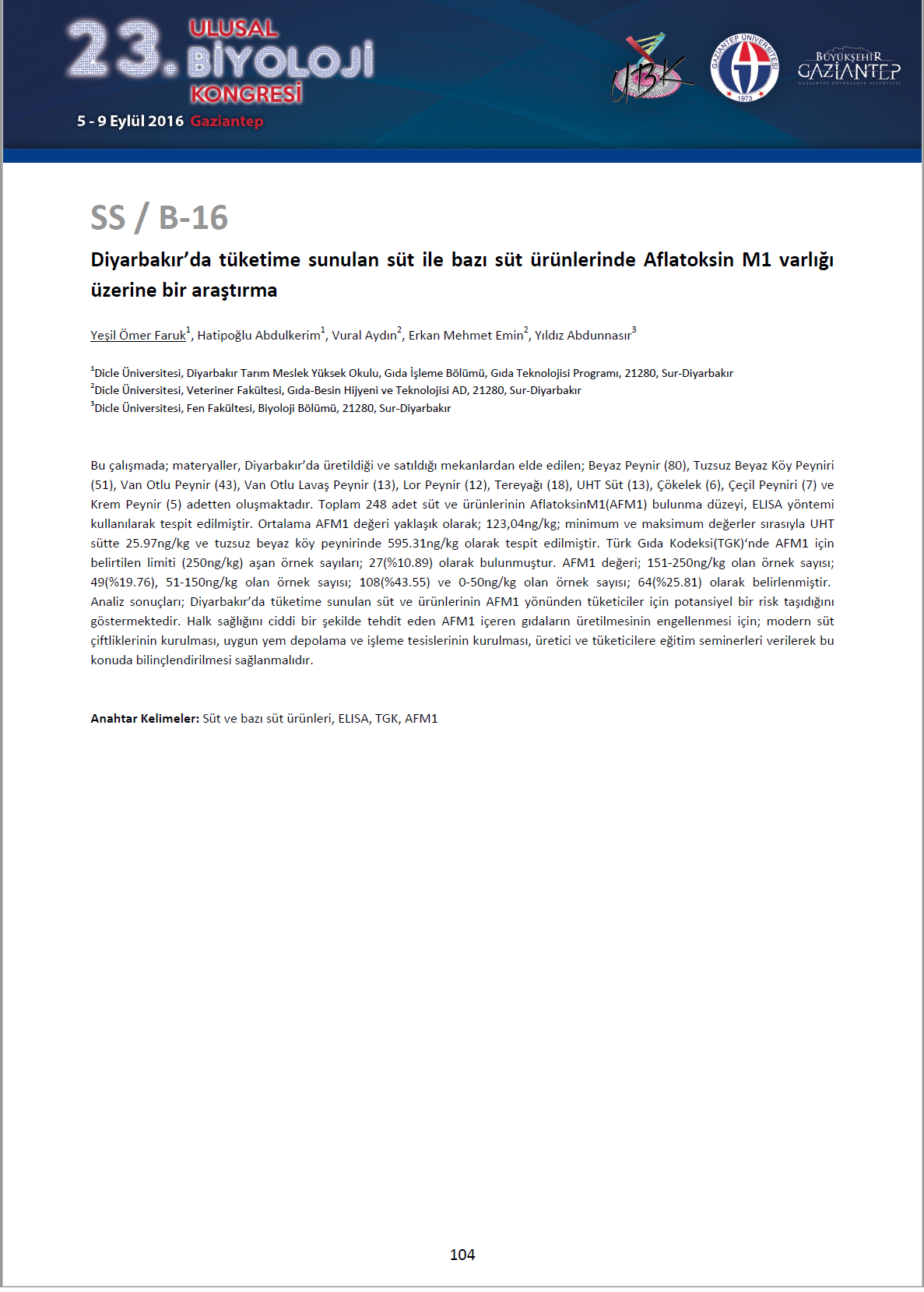 Bu çalışmada; materyaller, Diyarbakır’da üretildiği ve satıldığı mekanlardan elde edilen; Beyaz Peynir (80), Tuzsuz Beyaz Köy Peyniri (51), Van Otlu Peynir (43), Van Otlu Lavaş Peynir (13), Lor Peynir (12), Tereyağı (18), UHT Süt (13), Çökelek (6), Çeçil Peyniri (7) ve Krem Peynir (5) adetten oluşmaktadır. Toplam 248 adet süt ve ürünlerinin AflatoksinM1(AFM1) bulunma düzeyi, ELISA yöntemi kullanılarak tespit edilmiştir. Ortalama AFM1 değeri yaklaşık olarak; 123,04ng/kg; minimum ve maksimum değerler sırasıyla UHT sütte 25.97ng/kg ve tuzsuz beyaz köy peynirinde 595.31ng/kg olarak tespit edilmiştir. Türk Gıda Kodeksi(TGK)‘nde AFM1 için belirtilen limiti (250ng/kg) aşan örnek sayıları; 27(%10.89) olarak bulunmuştur. AFM1 değeri; 151-250ng/kg olan örnek sayısı; 49(%19.76), 51-150ng/kg olan örnek sayısı; 108(%43.55) ve 0-50ng/kg olan örnek sayısı; 64(%25.81) olarak belirlenmiştir. Analiz sonuçları; Diyarbakır’da tüketime sunulan süt ve ürünlerinin AFM1 yönünden tüketiciler için potansiyel bir risk taşıdığını göstermektedir. Halk sağlığını ciddi bir şekilde tehdit eden AFM1 içeren gıdaların üretilmesinin engellenmesi için; modern süt çiftliklerinin kurulması, uygun yem depolama ve işleme tesislerinin kurulması, üretici ve tüketicilere eğitim seminerleri verilerek bu konuda bilinçlendirilmesi sağlanmalıdır.